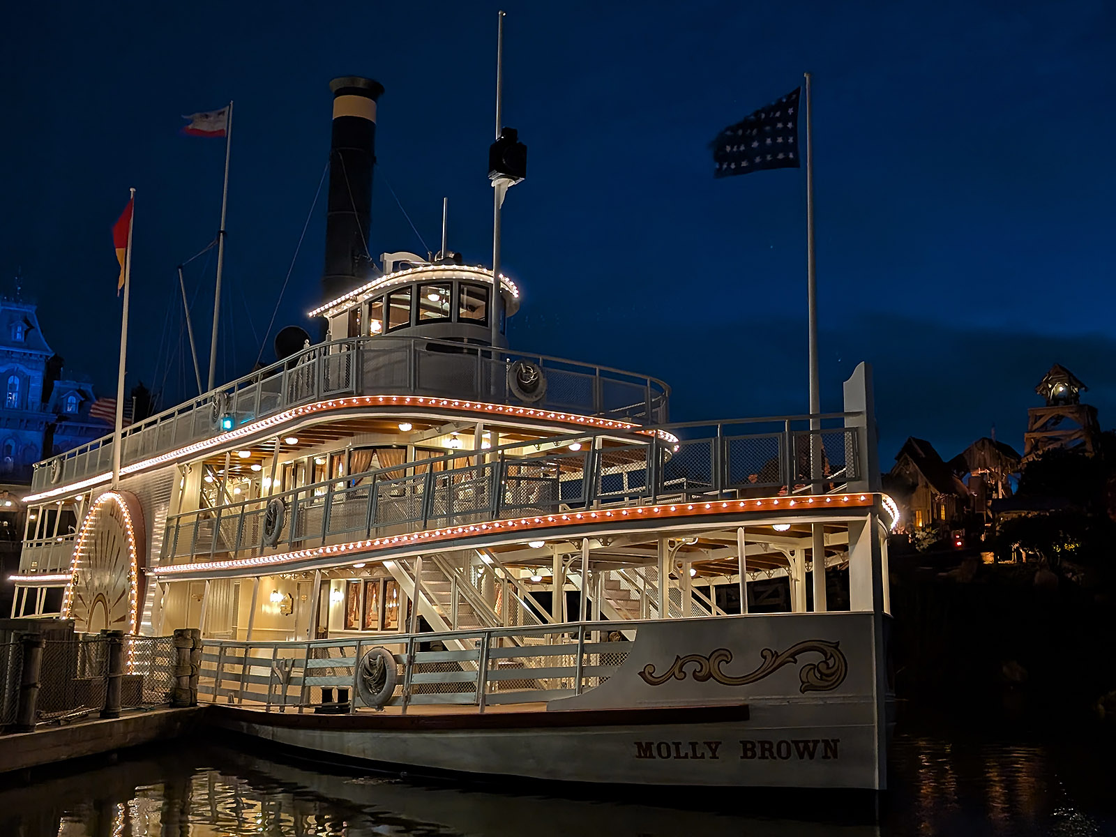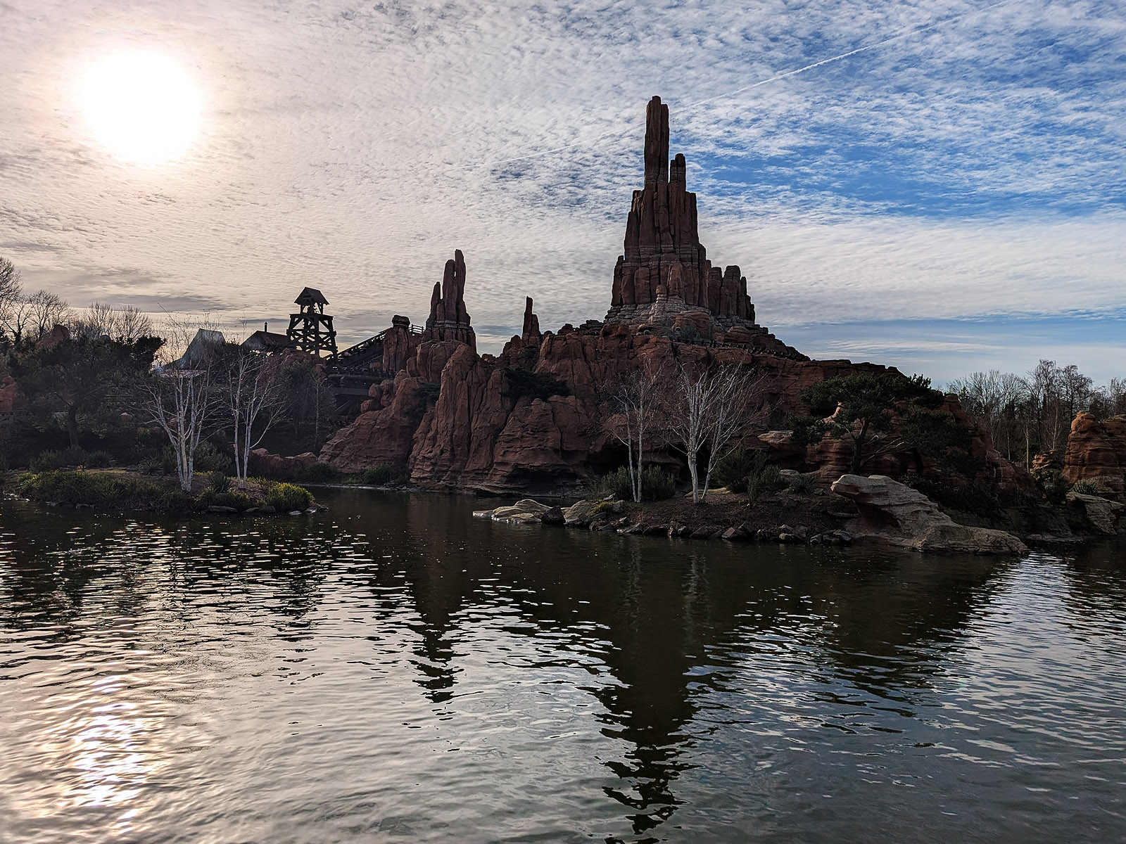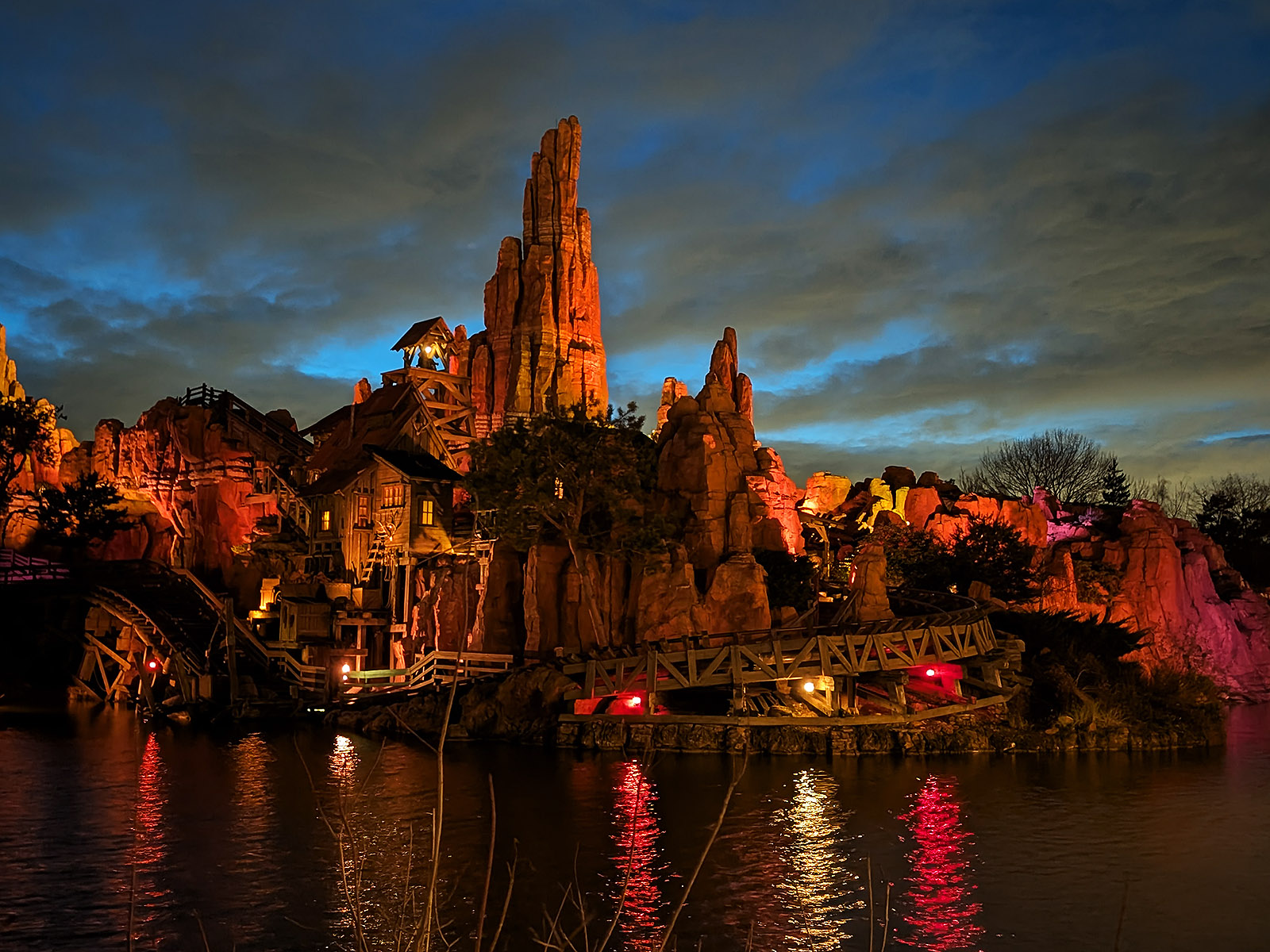 Auf der linken Seite befindet sich zunächst das "Frontierland", eine Hommage an die Zeit des Wilden Westens. Hier fällt zunächst ein riesiges Felsmassiv auf einem großen See ins Auge, durch das die Züge der Achterbahn "Big Thunder Mountain" donnern, die allerdings ihrem Namen nicht wirklich gerecht wird: Der Mine Train macht zwar durchaus Spaß, ist aber eher eine Familienattraktion, die zudem auch die Gehörgänge der Fahrgäste über Gebühr strapaziert. Den Besitzer der entsprechenden Mining Company findet man gleich in der Nähe bei "Phantom Manor", einer schaurig-schönen Themenfahrt, die in einem alten verlassenen Herrschaftshaus untergebracht wurde. Vor den Toren dieses Gebäudes startet übrigens auch die Fahrt mit einem Schaufelraddampfer, mit dem man eine gemächliche Rundfahrt um das Gebirge antreten und die Streckenführung der Achterbahn aus nächster Nähe begutachten kann.