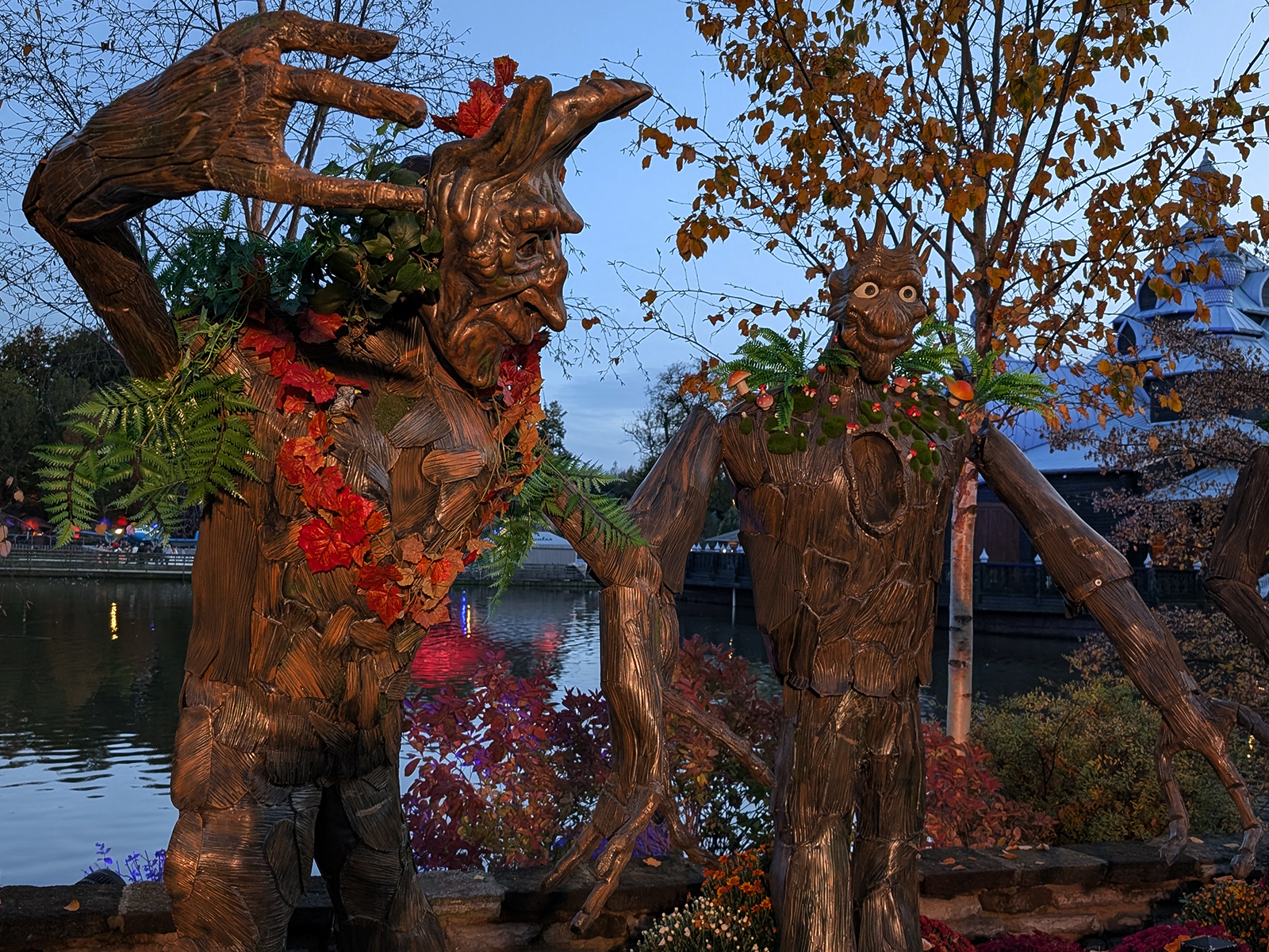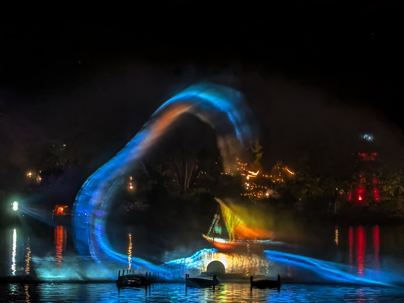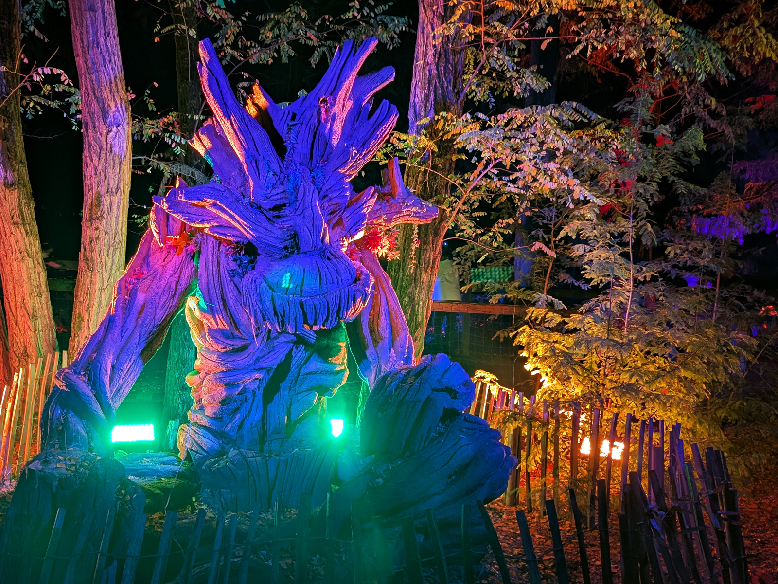 Zunächst einmal müssen wir ganz klar festhalten, dass in Pairi Daiza kein Horror-Event gefeiert wird wie in so manchem Freizeitpark. Vielmehr präsentiert man sich betont familienfreundlich und setzt statt auf Blut und Splatter ganz klar auf Atmosphäre und Spaß am Gruseln. Insbesondere die verschiedenen Lichtinstallationen wären hier hervorzuheben, darunter eine Wasserprojektion auf dem großen See des Parks, auf dem nicht nur eine riesige Seeschlange ihr Unwesen treibt, sondern sogar ein gigantischer Krake ein ganzes Schiff in die Tiefe reißt.