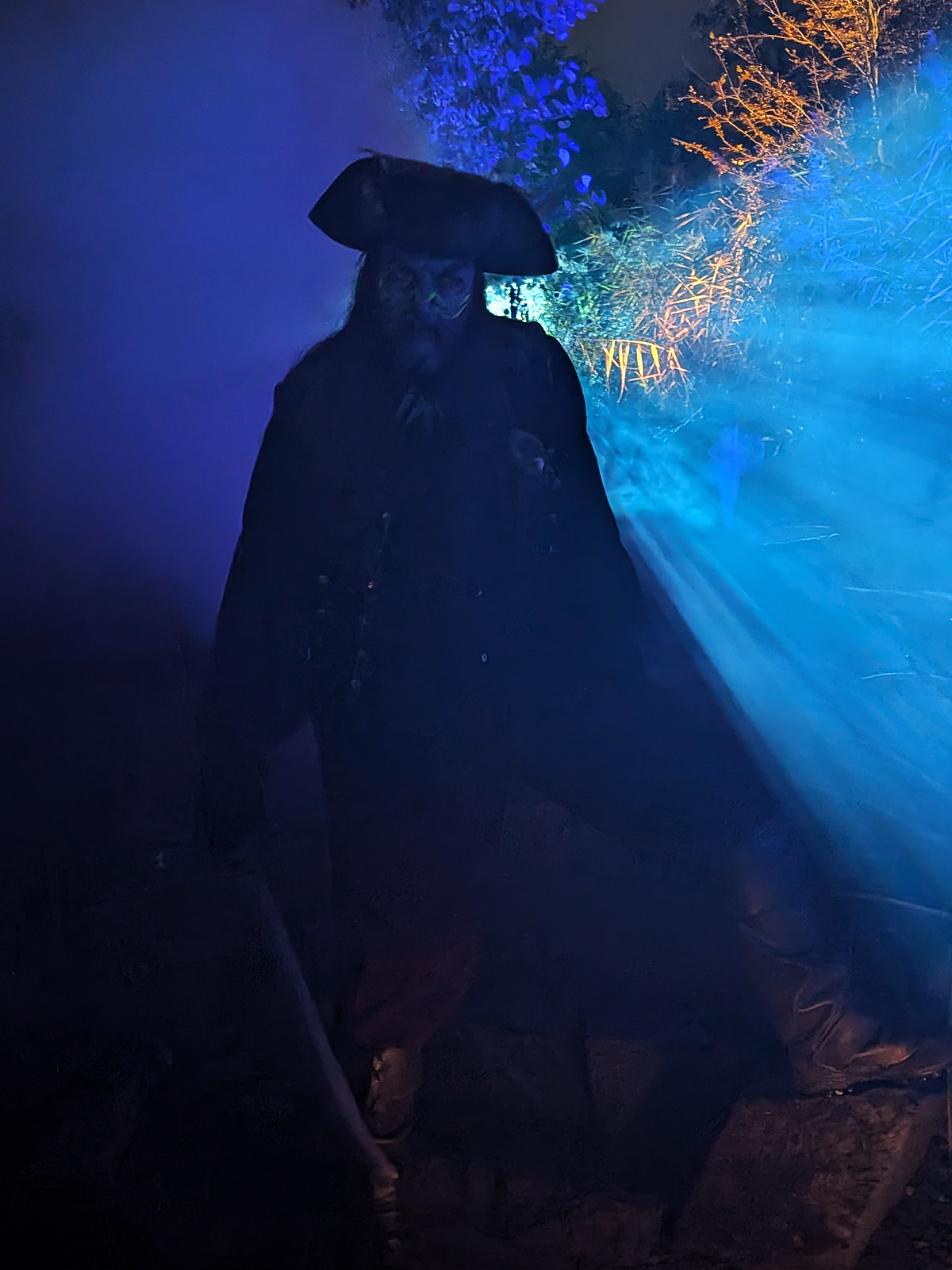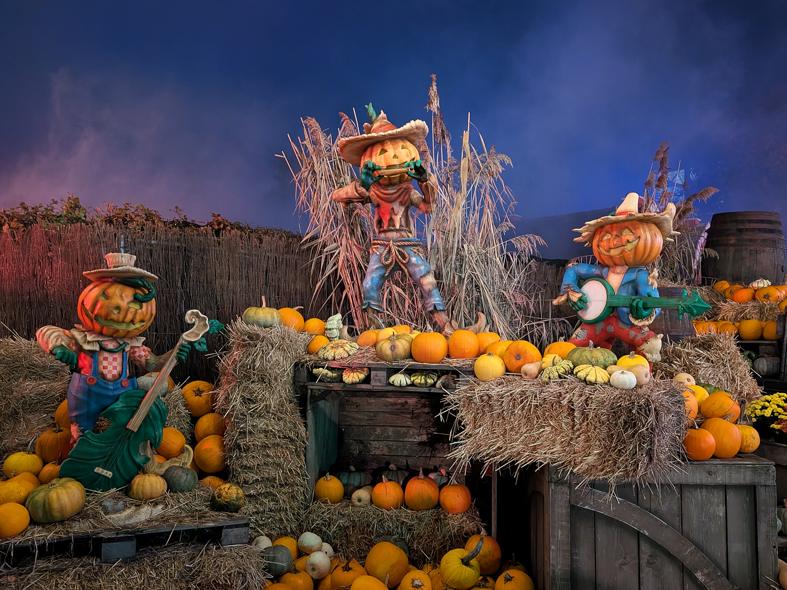 Thematisch werden hier verschiedenste Ängste angesprochen: Von verrückten Clowns mit Kettensägen über untote trojanische Krieger bis hin zu Seemonstern mit Piraten-Touch reicht die Palette der Gruppen, die jeweils später einen Teilbereich des Parks übernehmen. Diese Scare-Zones sind übrigens teilweise derart zugenebelt worden, dass man die eigene Hand kaum vor den Augen erkennen kann – geschweige denn irgendwelche seltsamen Gestalten, die durch die Besuchermengen wuseln. Dazu kommt noch eine akzentuierte Beleuchtung, Feuereffekte und eine jeweils zum Thema passende Musik.