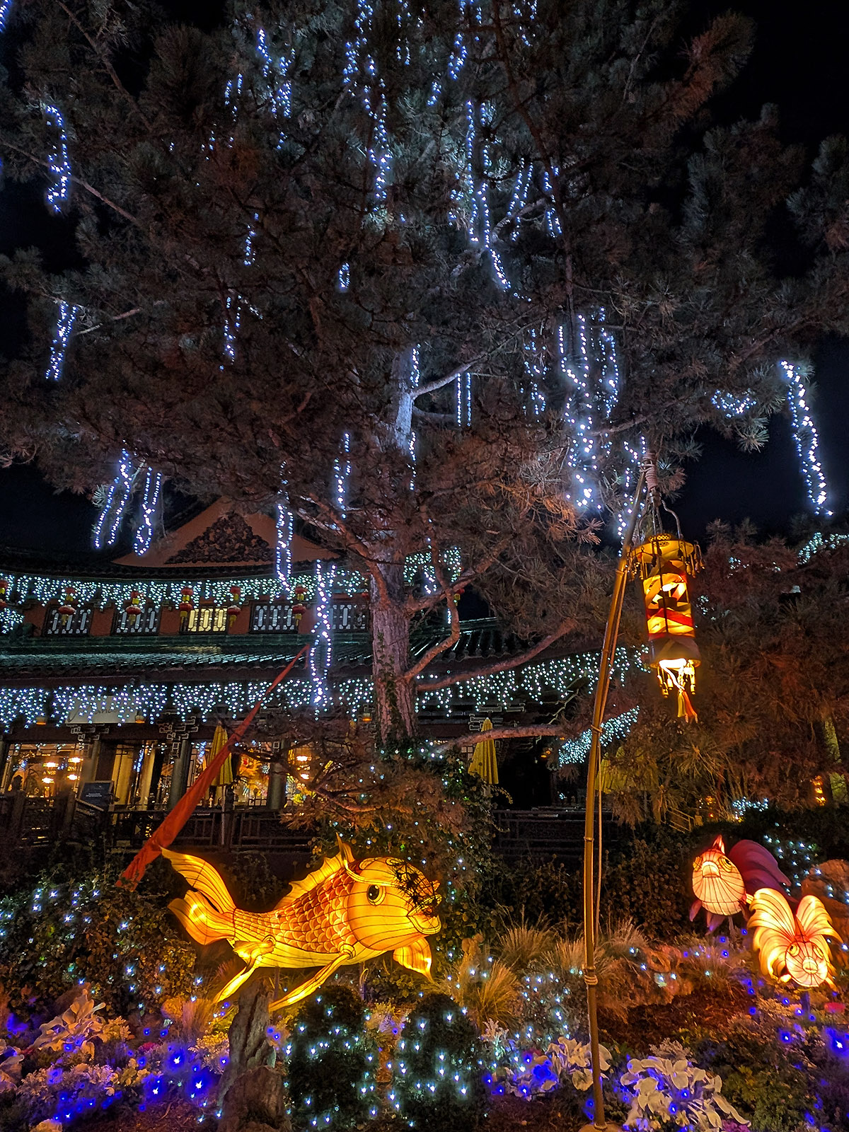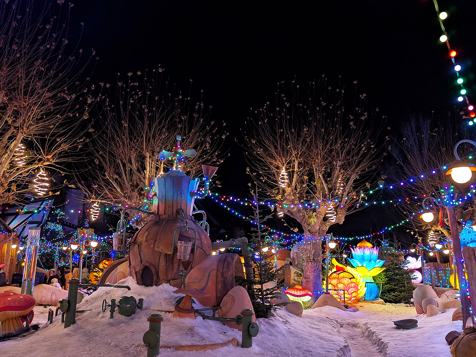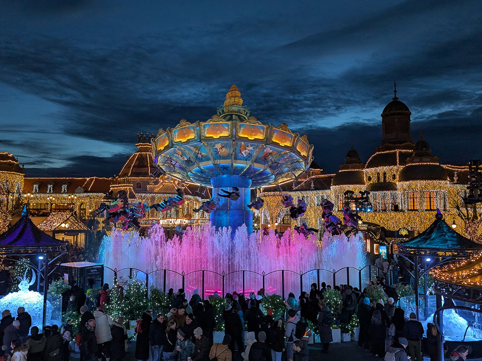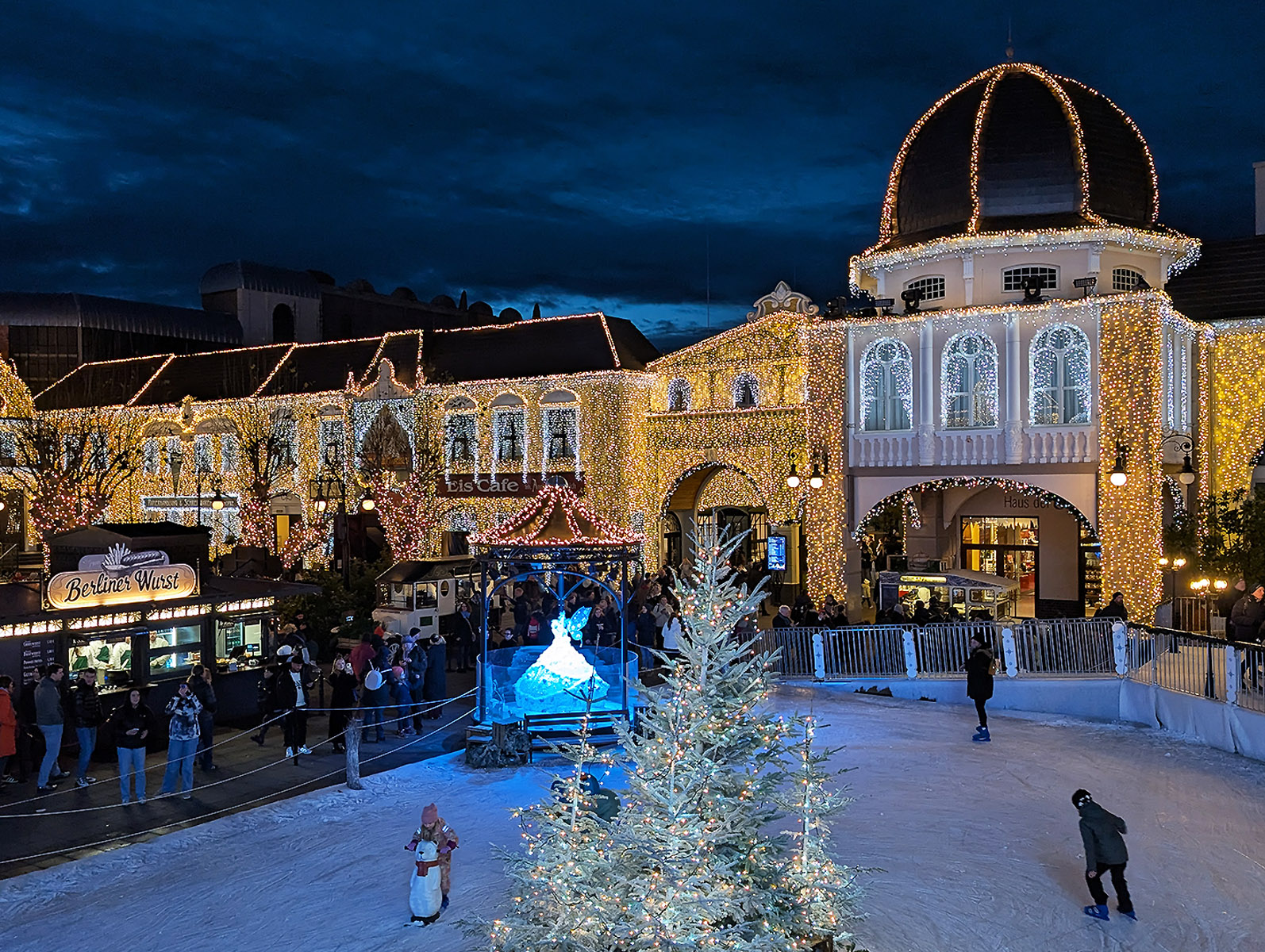 Und dieses Konzept zieht sich durch den gesamten Park – jede einzelne Themenwelt setzt auf eine eigene winterliche Erfahrung, die der Gast machen kann: In Berlin dominiert zum Beispiel das Klassische, Elegante und gleichzeitig auch Opulente, während in Rookburgh die Kälte und auch die Geschwindigkeit der Industrialisierung mit Laser-Shows dargestellt wird. Heimelig und gemütlich wirkt es hingegen auf dem Dorfplatz in Klugheim, während die tiefen Schluchten der benachbarten Achterbahn Taron in ein tiefrotes, wie Lava glühendes Licht getaucht werden. Und ganz besonders gelungen ist in diesem Jahr die chinesische Themenwelt, in der sich zu den bereits bekannten riesigen Lichterfiguren von Drachen nun auch noch weitere Ensembles aus Fischen und Pflanzen dazugesellt haben, die einen wundervollen Kontrast zu den ansonsten kaltweißen Illuminationselementen bilden.