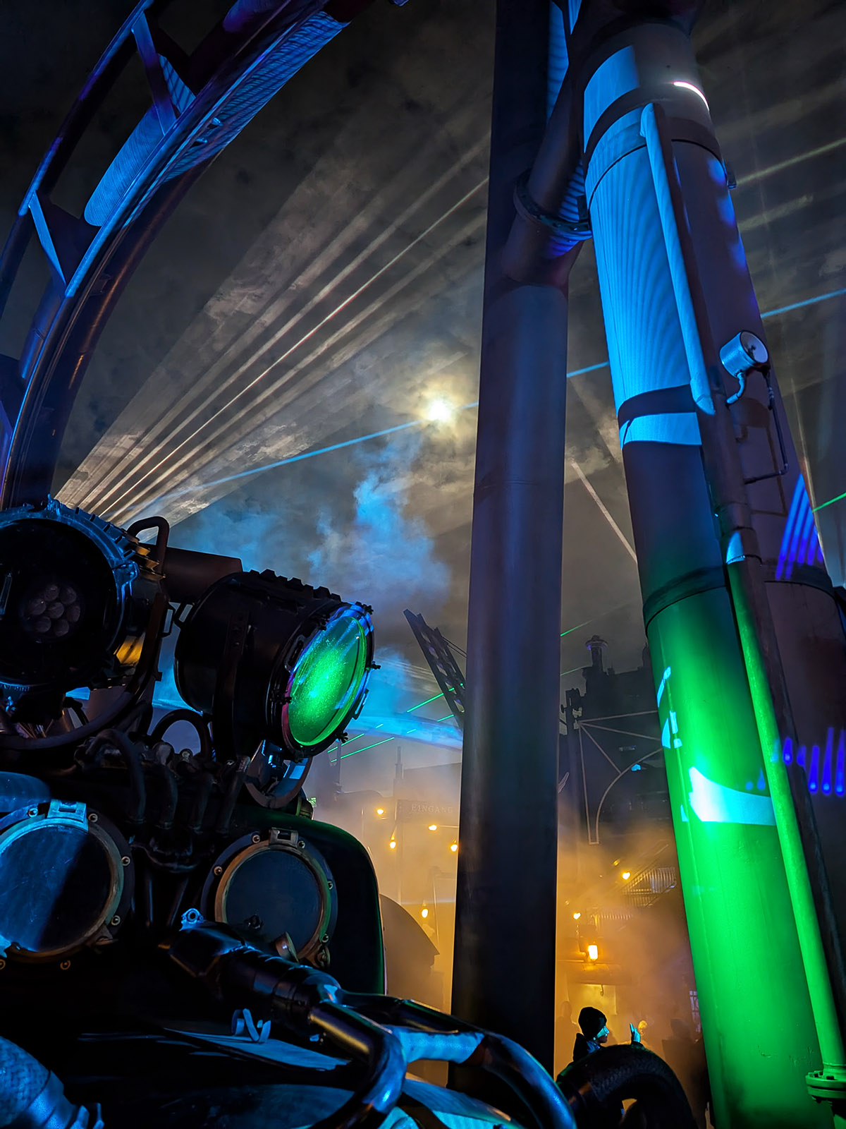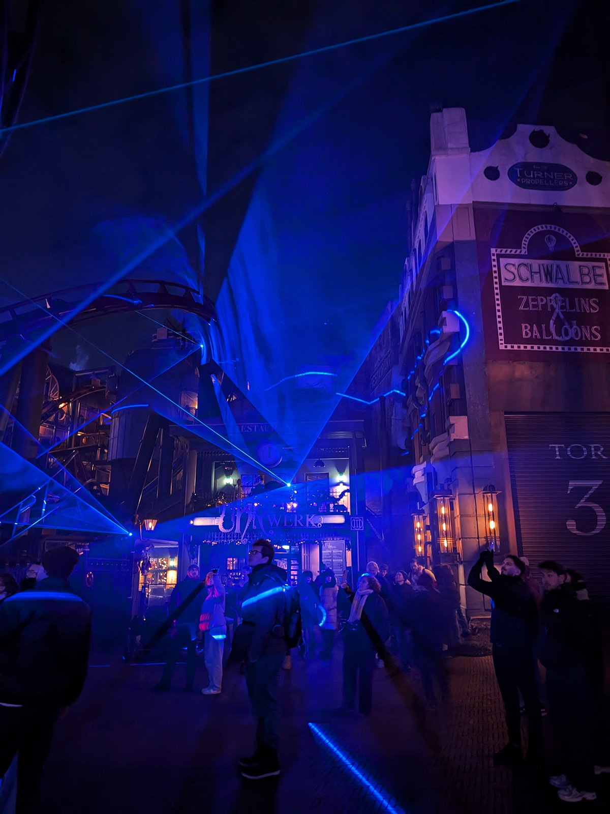 Ähnliches gilt übrigens auch für die große 3D-Mapping-Show "Tiempo de Fuego", bei die gewaltige Bergkulisse der Wasserbahn "Chiapas" mit Videoprojektionen und Feuereffekten zum Leben erweckt wird. Das Mystery Castle dient übrigens ebenfalls als Leinwand für eine Mapping-Show, die allerdings keine feste Uhrzeit hat, durchgehend läuft und man dementsprechend auch keinen Platz sichern muss. Auch bei "Pulse of Rookburgh", einer extrem immersiven Laser-Show, bei der die gesamte Themenwelt mit Lasern durchflutet wird und man im wahrsten Sinne des Worten mitten drin steht, ist es nicht nötig, bereits viel früher dort zu sein.